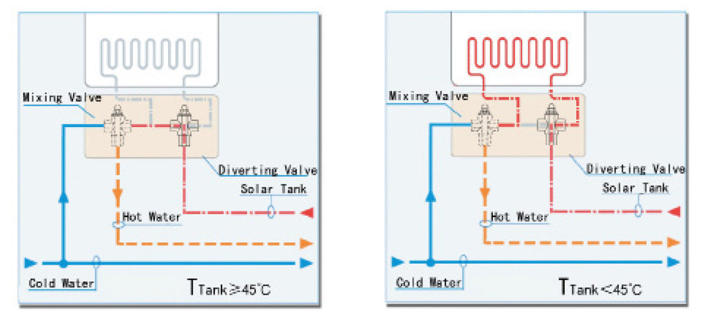 When temperature of preheated water from solar tank is lower than 45 deg, the hot water port fully closed while the cold water port fully opened in the diverting valve. The cold water from diverter valve goes boiler to be heated, then goes into mixing valve together with cold water to form the desired temperature water for using point.